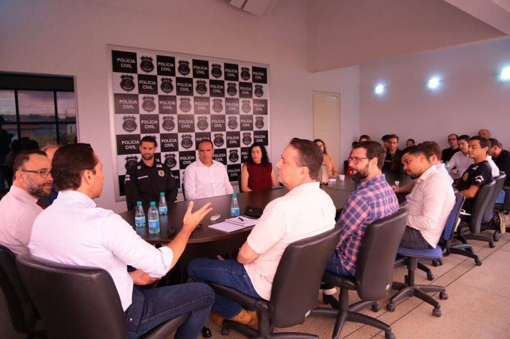 O prefeito de Aparecida de Goiânia, Leandro Vilela, e o vice-prefeito João Campos, delegado aposentado, se reuniram nesta quarta-feira, 04, com o delegado regional André Augusto Botesini Jorge, a delegada da Mulher, Bruna Soares e todos os demais delegados e delegadas que atuam no município. O encontro foi realizado na 2ª Delegacia Regional de Polícia, localizada na região central da cidade, onde foram discutidas ações de enfrentamento ao crime, melhorias estruturais e o fortalecimento da integração entre as forças de segurança.