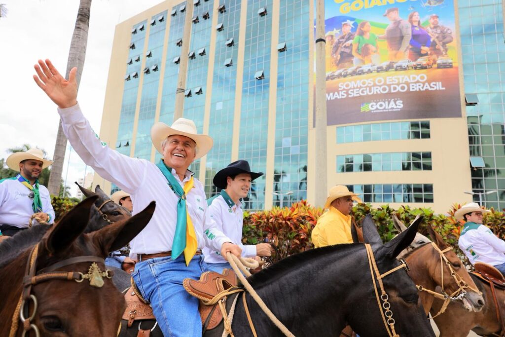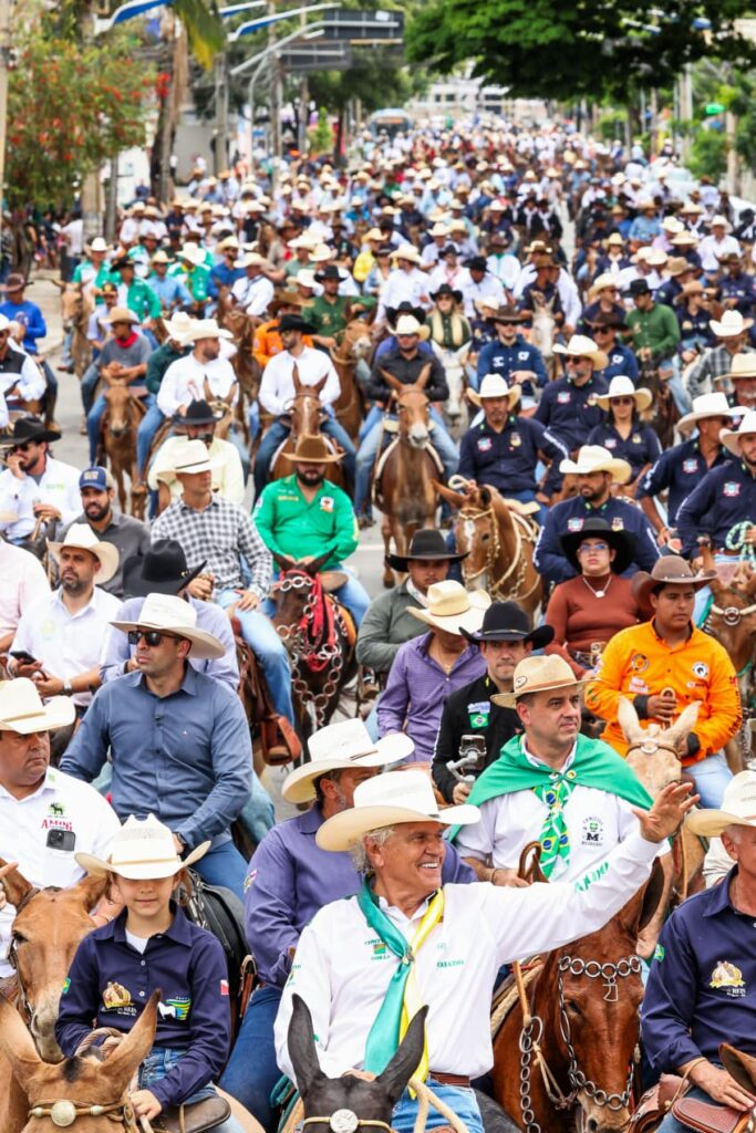 Caiado e Daniel Vilela lideram cavalgada de muladeiros durante o 3º Encontro de Comitivas, em Goiânia